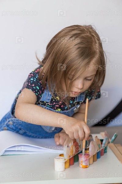 Искусство и творчество. Счастливая маленькая девочка 4 лет рисует на бумаге. Детские игры для развития ребенка. Детский сад