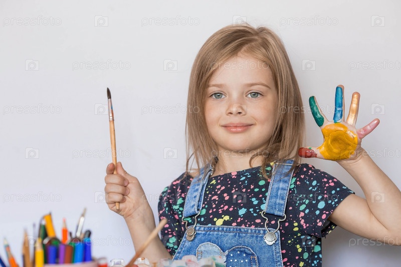 Счастливая маленькая девочка 4 лет рисует. Руки ребенка покрыты краской. Фокус камеры находится на ладонях. Детские игры для развития ребенка. Детский сад