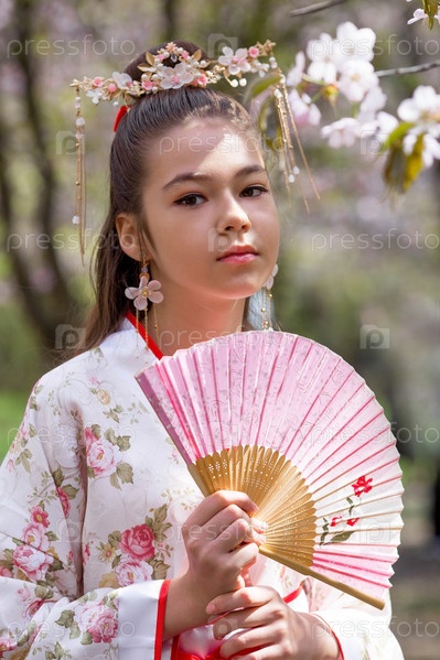 Портрет. Красивая девушка в японском кимоно в японском саду на фоне цветущей сакуры. Цветение сакуры в саду в Бирюлевском дендрарии. Россия, Царицыно, 2023