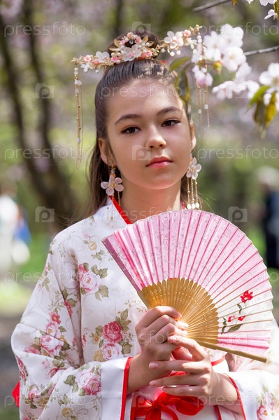 Портрет. Красивая девушка в японском кимоно в японском саду на фоне цветущей сакуры. Цветение сакуры в саду в Бирюлевском дендрарии. Россия, Царицыно, 2023