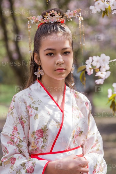 Портрет. Красивая девушка в японском кимоно в японском саду на фоне цветущей сакуры. Цветение сакуры в саду в Бирюлевском дендрарии. Россия, Царицыно, 2023