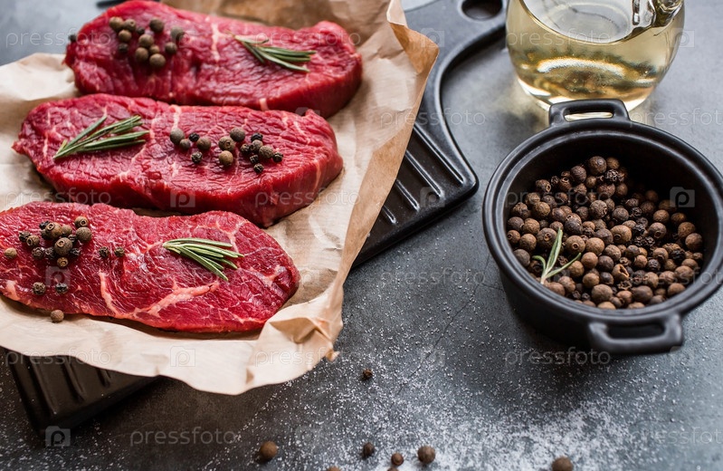Свежее мясо. Стейки из сырой говядины с розмарином и специями на пергаментной бумаге на стильной доске. Плоский вид сверху