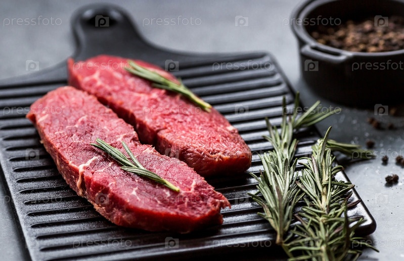 Свежее мясо. Стейки из сырой говядины с розмарином и специями на стильной доске. Плоский вид сверху