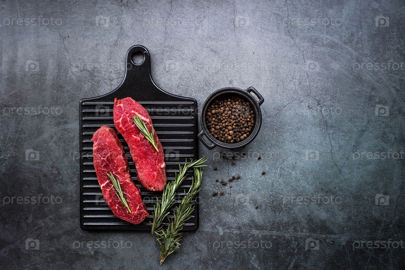 Свежее мясо. Стейки из сырой говядины с розмарином и специями на стильной доске. Плоский вид сверху