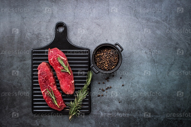 Свежее мясо. Стейки из сырой говядины с розмарином и специями на стильной доске. Плоский вид сверху