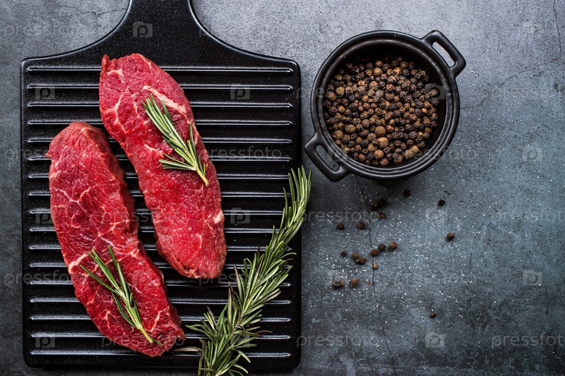 Свежее мясо. Стейки из сырой говядины с розмарином и специями на стильной доске. Плоский вид сверху