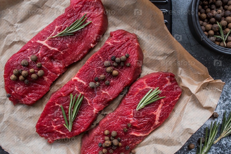 Свежее мясо. Стейки из сырой говядины с розмарином и специями на пергаментной бумаге на стильной доске. Плоский вид сверху