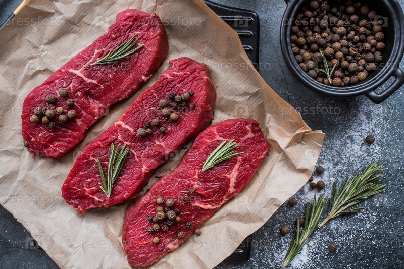 Свежее мясо. Стейки из сырой говядины с розмарином и специями на пергаментной бумаге на стильной доске. Плоский вид сверху