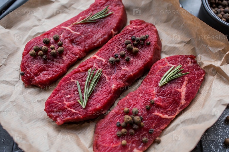 Свежее мясо. Стейки из сырой говядины с розмарином и специями на пергаментной бумаге на стильной доске. Плоский вид сверху