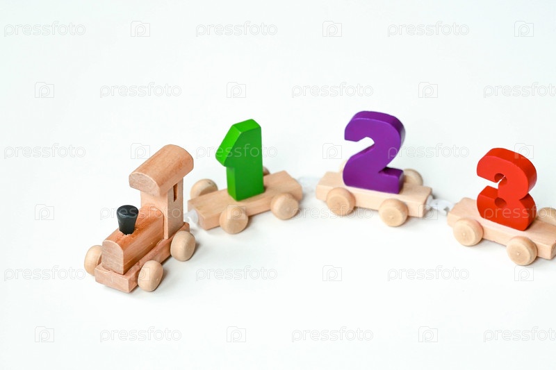 Деревянный поезд с номерами на белом изолированном фоне. Детские развивающие логические игрушки используются в играх Монтессори для развития