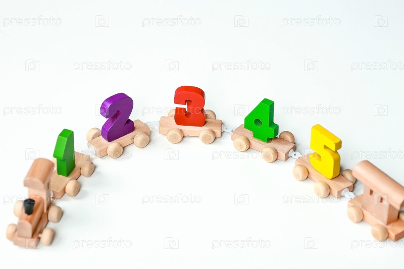 Деревянный поезд с номерами на белом изолированном фоне. Детские развивающие логические игрушки используются в играх Монтессори для развития