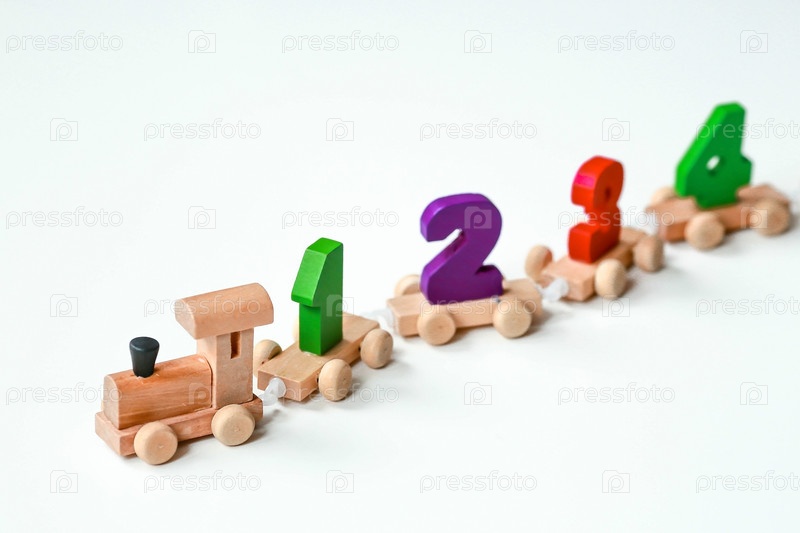 Деревянный поезд с номерами на белом изолированном фоне. Детские развивающие логические игрушки используются в играх Монтессори для развития