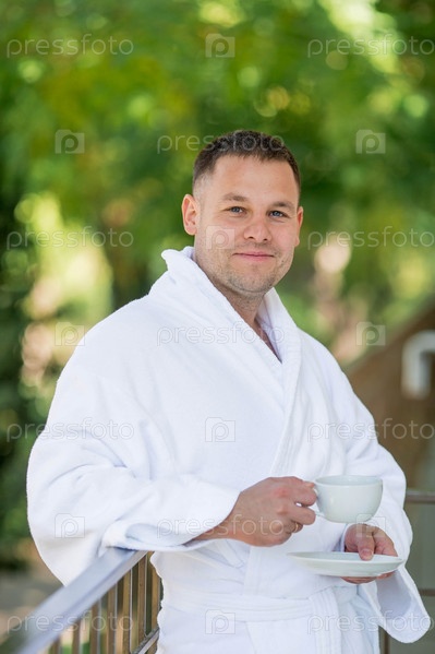 Чашка горячего чая в руках красивого улыбчивого мужчины 30+ в белом халате. Утро жениха. Концепция размещения в отеле и начало свадебного дня