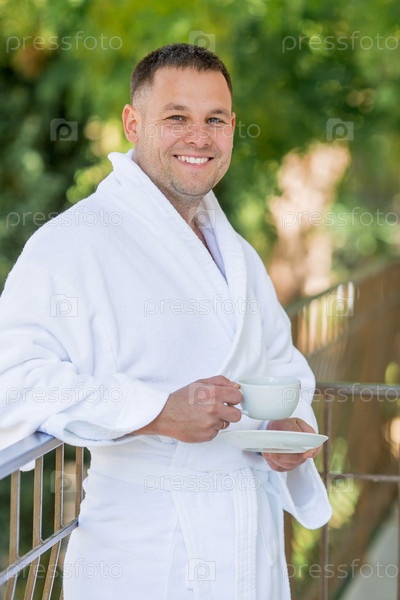 Чашка горячего чая в руках красивого улыбчивого мужчины 30+ в белом халате. Утро жениха. Концепция размещения в отеле и начало свадебного дня