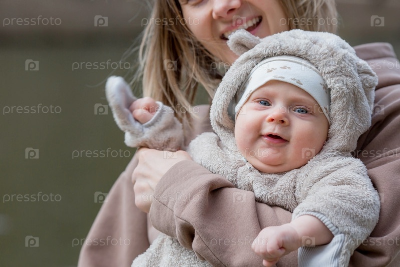 Молодая мама держит на руках очаровательного сынишку. Малыш смотрит в камеру и улыбается. Портрет красивого пухлого 4-месячного ребенка