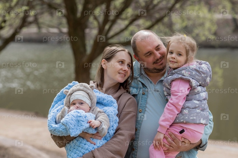 Семья.Отец. Молодая мама держит на руках очаровательного сынишку. Малыш смотрит в камеру и улыбается. Портрет красивого пухлого 4-месячного ребенка