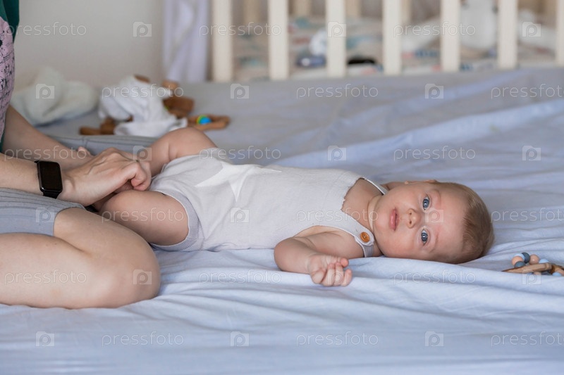 Молодая мать переодевает своего очаровательного новорожденного сына в постели по утрам. Ребенок смотрит в камеру. Семья и забота
