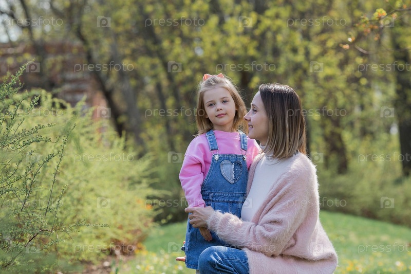 Красивая маленькая девочка в розовой одежде гуляет со своей мамой в парке на свежем воздухе. Семья, дети, материнство