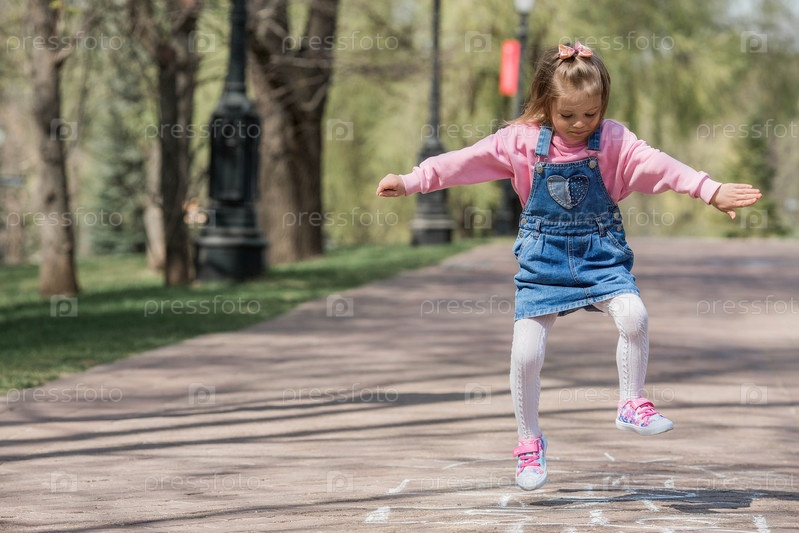 Счастливая девушка в розовой одежде рисует классику мелом на асфальте на улице. Портрет маленькой девочки, играющей и прыгающей в классики в солнечный летний день. Творческое развитие детей