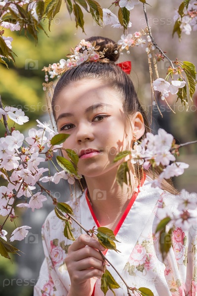 Портрет. Красивая девушка в японском кимоно в японском саду на фоне цветущей сакуры. Цветение сакуры в саду в Бирюлевском дендрарии. Россия, Царицыно, 2023