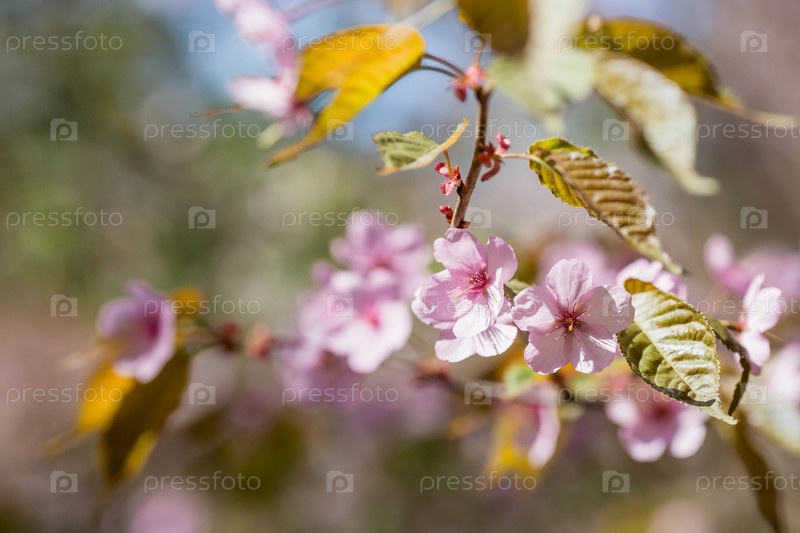 Баннер. Вишневый цвет в Москве. Обои весна, природа. Японская вишня в саду. Цветущие почки на ветвях дерева в японском саду в дендрарии. Макро фотография. Россия, Царицыно
