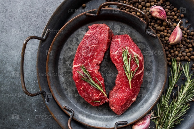Свежее мясо. Стейки из сырой говядины с розмарином и специями на стильном железном подносе. Плоский вид сверху