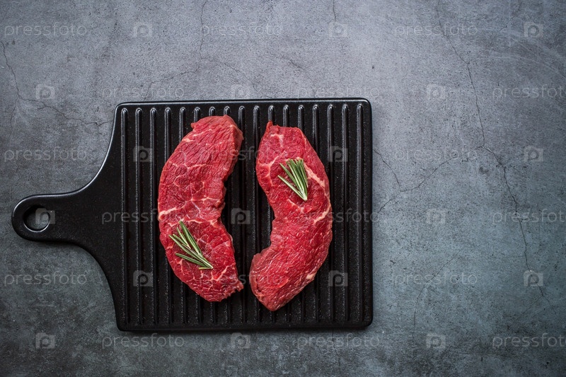 Свежее мясо. Стейки из сырой говядины на стильной доске. Плоский вид сверху
