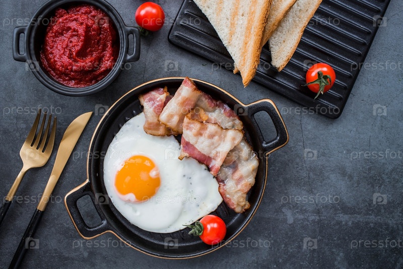Жареные яйца на стильной керамической тарелке с ручками с жареным беконом, помидорами черри, томатной пастой и хлебными тостами на темном фоне. Завтрак обед и ужин. Вкусная еда