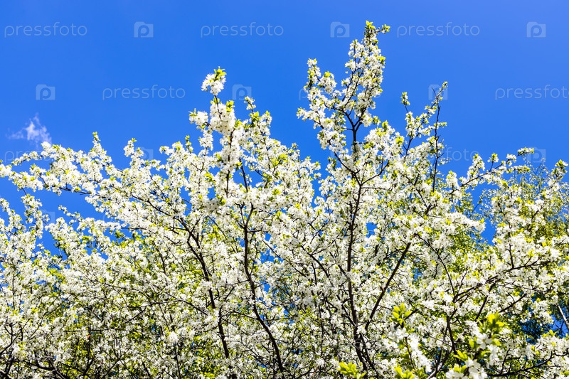 Уш белоцветящее вишневое дерево под голубым небом
