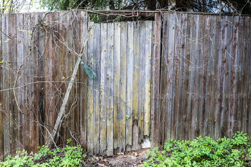 Вид спереди на закрытую калитку в ветхом деревянном заборе