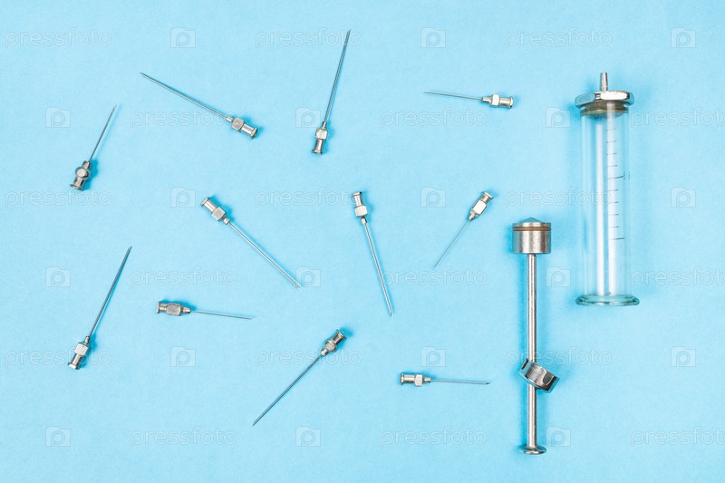 Стальные иглы для подкожных инъекций и стеклянный шприц на синем