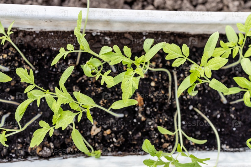 Рассада зеленых помидоров в почве в коробке на земле