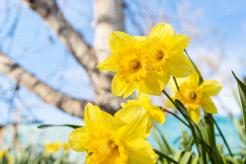Ниже вид на желтые цветы нарцисса крупным планом