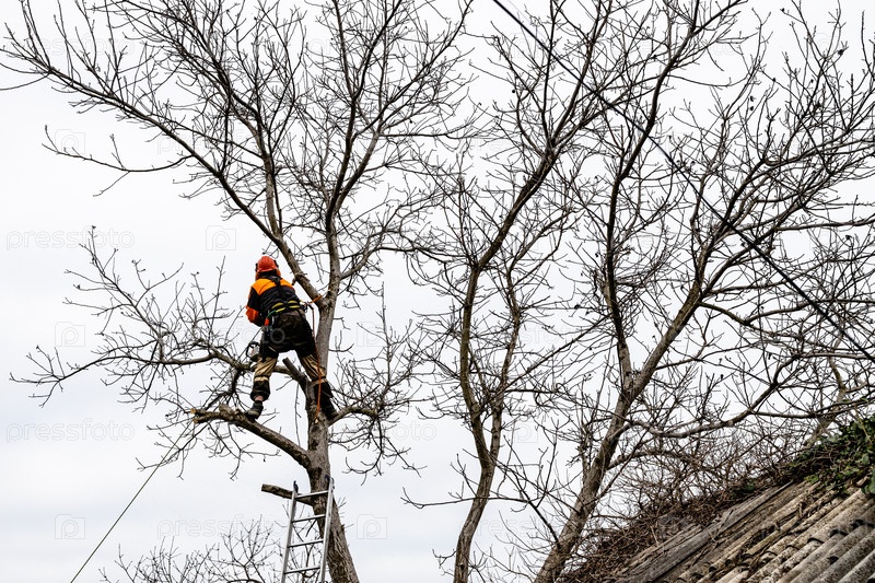 Лесовод разбирает ореховое дерево на заднем дворе