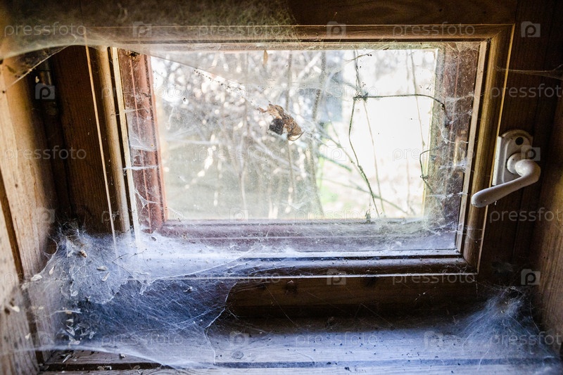 Паутина на закрытом окне деревянного деревенского дома
