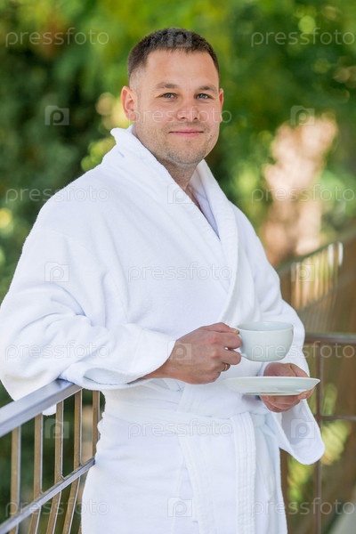 Чашка горячего чая в руках красивого улыбчивого мужчины 30+ в белом халате. Утро жениха. Концепция размещения в отеле и начало свадебного дня
