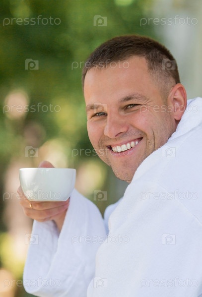 Чашка горячего чая в руках красивого улыбчивого мужчины 30+ в белом халате. Утро жениха. Концепция размещения в отеле и начало свадебного дня
