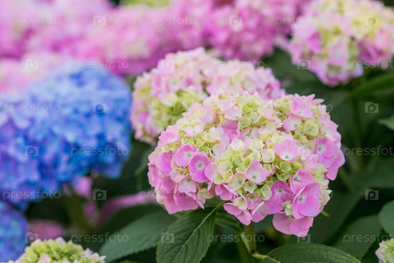 Летнее фото или фон с разноцветными цветами. Красивая сцена природы с цветущим деревом. Красивые здоровые гортензии, цветущие голубыми, розовыми и лиловыми оттенками