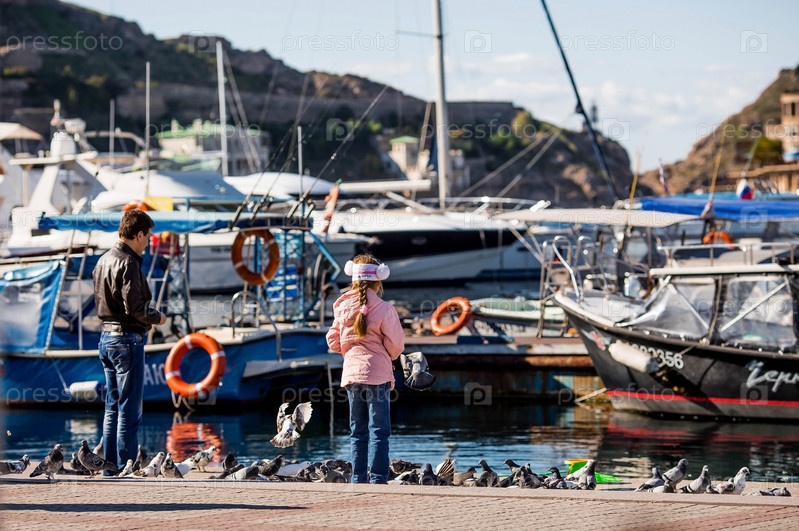 Портовый город Балаклава. Городской ландшафт. Лодки, яхты. Променад. Девушка кормит голубей. Россия, Крым, октябрь (2018)