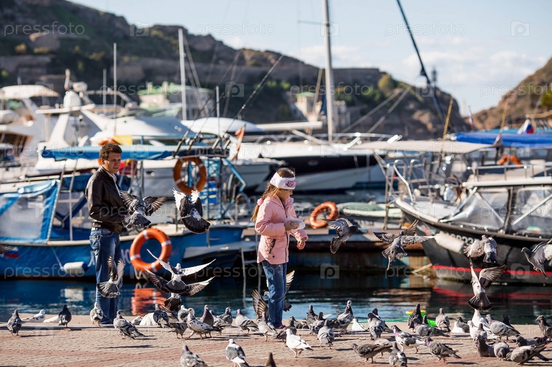 Портовый город Балаклава. Городской ландшафт. Лодки, яхты. Променад. Девушка кормит голубей. Россия, Крым, октябрь (2018)