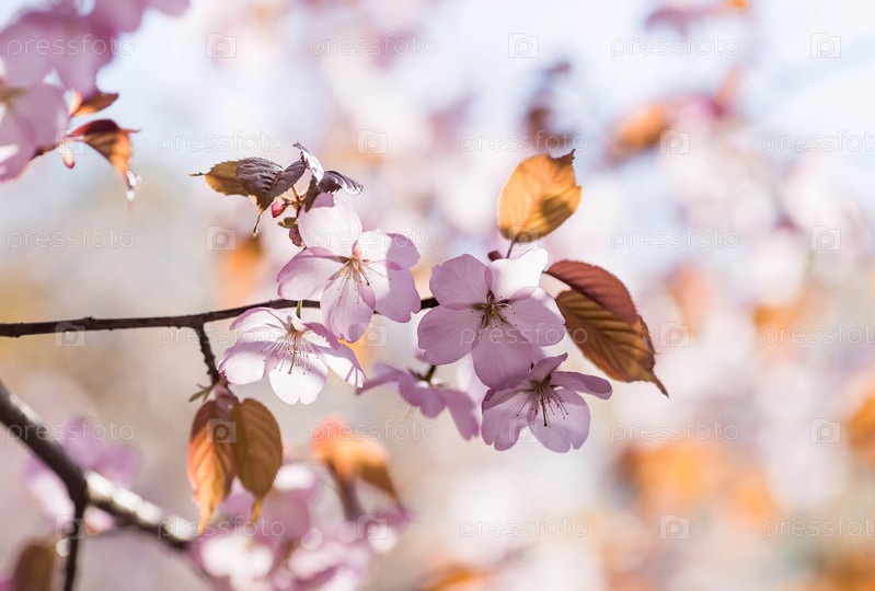 Баннер. Вишневый цвет в Москве. Обои весна, природа. Японская вишня в саду. Цветущие почки на ветвях дерева в японском саду в дендрарии. Макро фотография. Россия, Царицыно