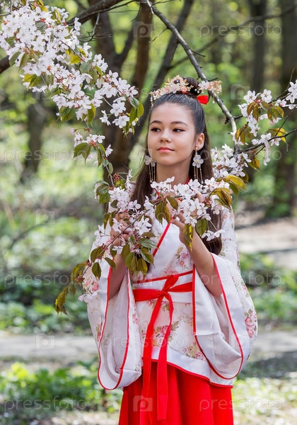 Портрет. Красивая девушка в японском кимоно в японском саду на фоне цветущей сакуры. Цветение сакуры в саду в Бирюлевском дендрарии. Россия, Царицыно, 2023