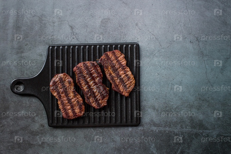Свежее мясо. Жареные стейки из говядины на стильной доске на темном фоне. Плоский вид сверху