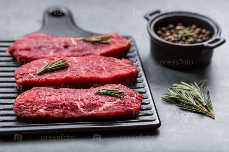 Свежее мясо. Стейки из сырой говядины с розмарином и специями на стильной доске. Плоский вид сверху