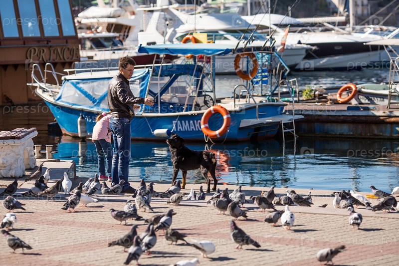 Портовый город Балаклава. Городской ландшафт. Лодки, яхты. Променад. Девушка кормит голубей. Россия, Крым, октябрь (2018)