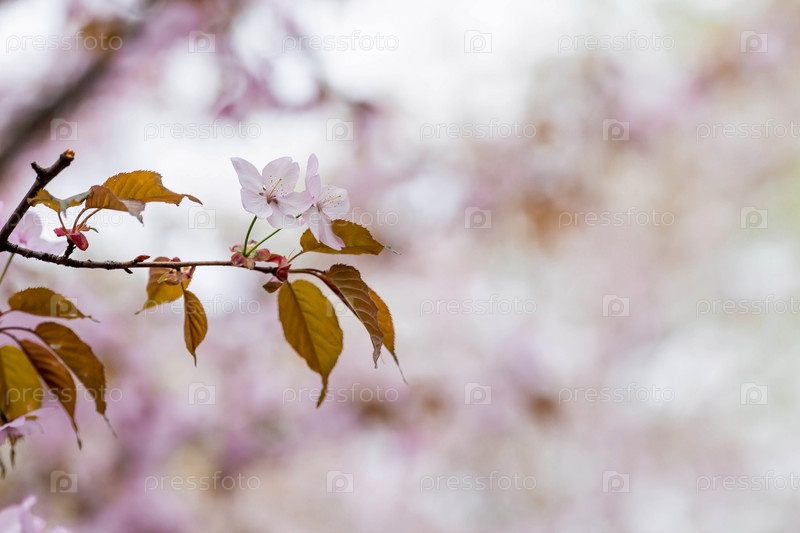 Баннер. Вишневый цвет в Москве. Обои весна, природа. Японская вишня в саду. Цветущие почки на ветвях дерева в японском саду в дендрарии. Макро фотография. Россия, Царицыно