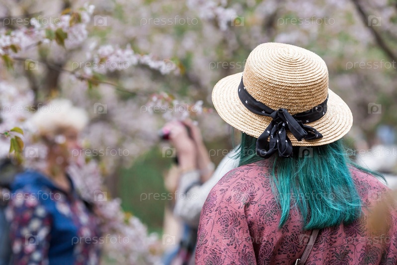 Портрет. Девушка в соломенной шляпе в японском саду на фоне цветущей сакуры. Цветение сакуры в саду Бирюлевского дендрария. Россия, Царицыно, 2023