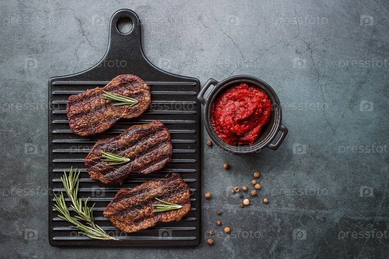 Свежее мясо. Жареные стейки из говядины с розмарином, специями и томатной пастой на стильной доске. Плоский вид сверху