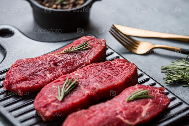 Свежее мясо. Стейки из сырой говядины с розмарином и специями на стильной доске. Плоский вид сверху