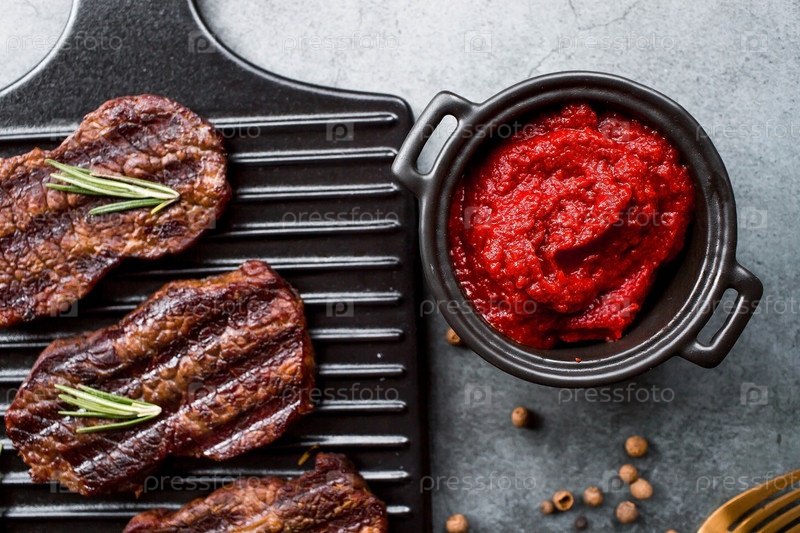 Свежее мясо. Жареные стейки из говядины с розмарином, специями и томатной пастой на стильной доске. Плоский вид сверху